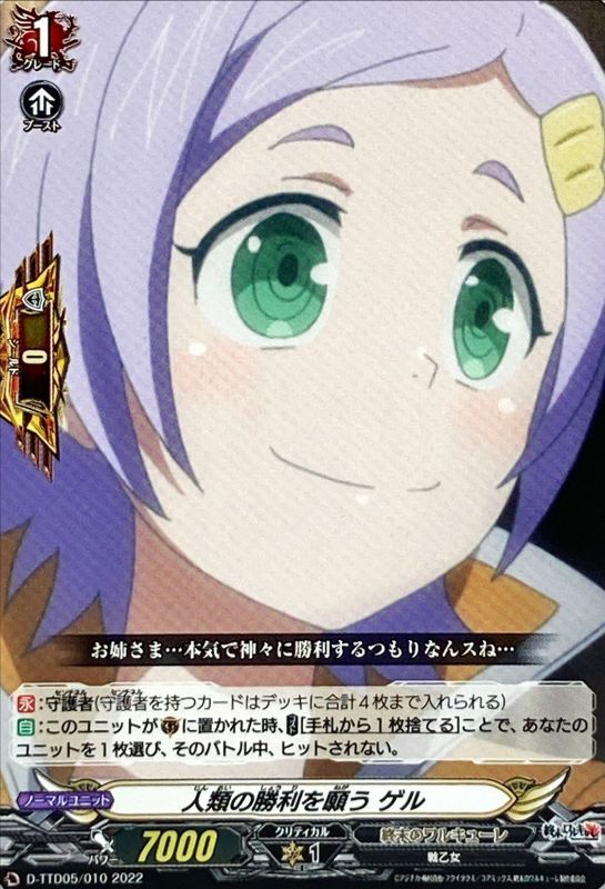 【永】:守護者(守護者を持つカードはデッキに合計4枚まで入れられる)【自】:このユニットが(G)に置かれた時、【コスト】[手札から1枚捨てる]ことで、あなたのユニットを1枚選び、そのバトル中、ヒットされない。