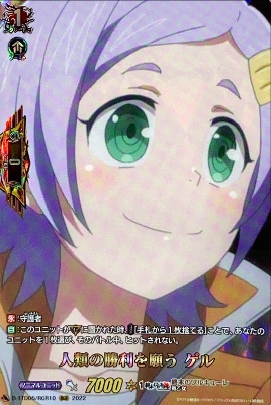 【永】:守護者【自】:このユニットが(G)に置かれた時、【コスト】[手札から1枚捨てる]ことで、あなたのユニットを1枚選び、そのバトル中、ヒットされない。
