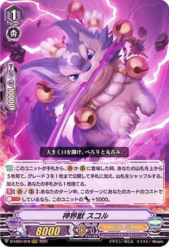 【自】:このユニットが手札から、(V)か(R)に登場した時、あなたの山札を上から5枚見て、グレード3を1枚まで公開して手札に加え、山札をシャッフルする。加えたら、あなたの手札から1枚捨てる。【永】【(V)/(R)】:あなたのターン中、このターンにあなたのカードのコストで【ソウルブラスト】しているなら、このユニットのパワー+5000。