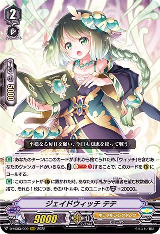 【自】:あなたのターンにこのカードが手札から捨てられた時、「ウィッチ」を含むあなたのヴァンガードがいるなら、【コスト】[【ソウルブラスト】(1)]することで、このカードを(R)にコールする。【自】:このユニットが(G)に置かれた時、あなたの手札から守護者を望む枚数選び、捨て、それら1枚につき、そのバトル中、このユニットのシールド+20000。