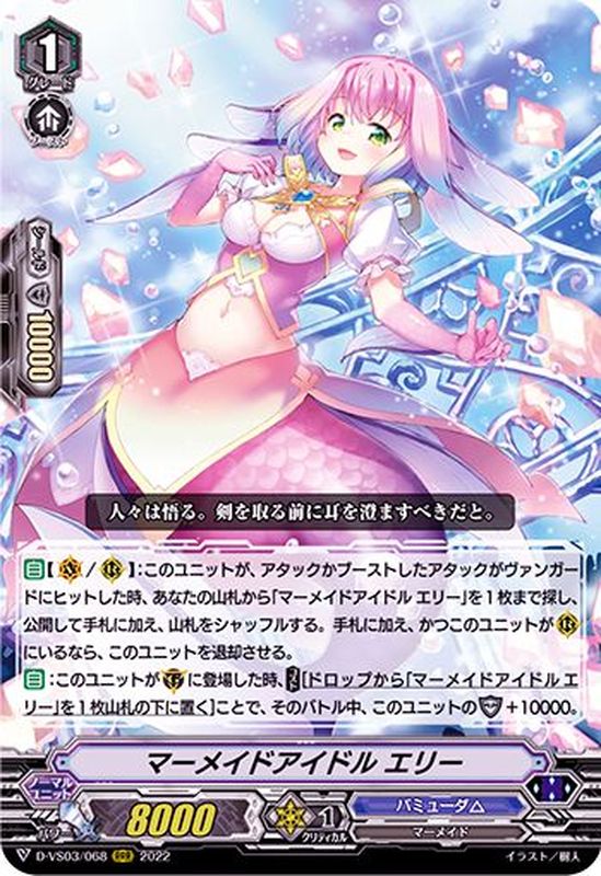 【自】【(V)/(R)】:このユニットが、アタックかブーストしたアタックがヴァンガードにヒットした時、あなたの山札から「マーメイドアイドル エリー」を1枚まで探し、公開して手札に加え、山札をシャッフルする。手札に加え、このユニットが(R)にいるなら、このユニットを退却させる。【自】:このユニットが(G)に登場した時、【コスト】[ドロップから「マーメイドアイドル エリー」を1枚山札の下に置く]ことで、そのバトル中、このユニットのシールド+10000。