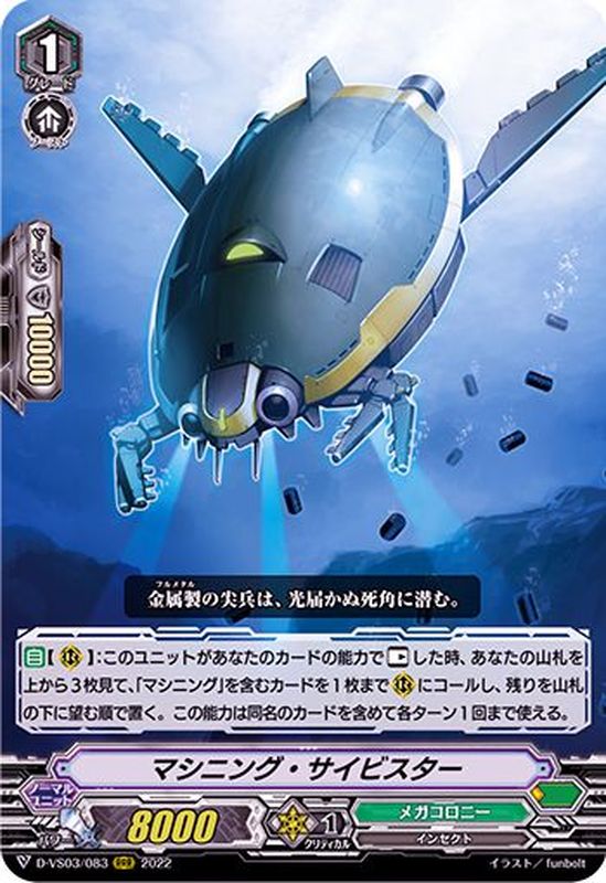 【自】【(R)】:このユニットがあなたのカードの能力で【レスト】した時、あなたの山札を上から3枚見て、「マシニング」を含むカードを1枚まで(R)にコールし、残りを山札の下に望む順で置く。この能力は同名のカードを含めて各ターン1回まで使える。