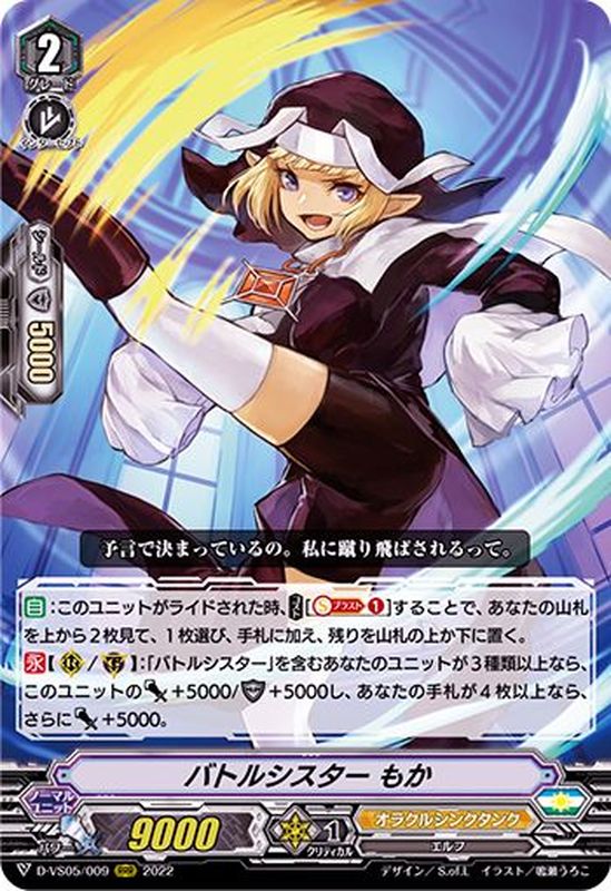 【自】:このユニットがライドされた時、【コスト】[【ソウルブラスト】(1)]することで、あなたの山札を上から2枚見て、1枚選び、手札に加え、残りを山札の上か下に置く。【永】【(R)/(G)】:「バトルシスター」を含むあなたのユニットが3種類以上なら、このユニットのパワー+5000/シールド+5000し、あなたの手札が4枚以上なら、さらにパワー+5000。