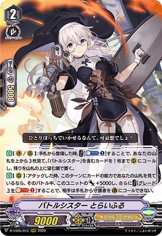 【自】【(V)/(R)】:手札から登場した時、【コスト】[【カウンターブラスト】(1)]することで、あなたの山札を上から3枚見て、「バトルシスター」を含むカードを1枚まで(R)にコールし、残りを山札の上に望む順で置く。【自】【(R)】:アタックした時、このターンにカードの能力であなたの山札を見ているなら、そのバトル中、このユニットのパワー+5000し、さらに【コスト】[グレード3を【ソウルブラスト】(1)]することで、相手は手札から守護者を(G)にコールできない。