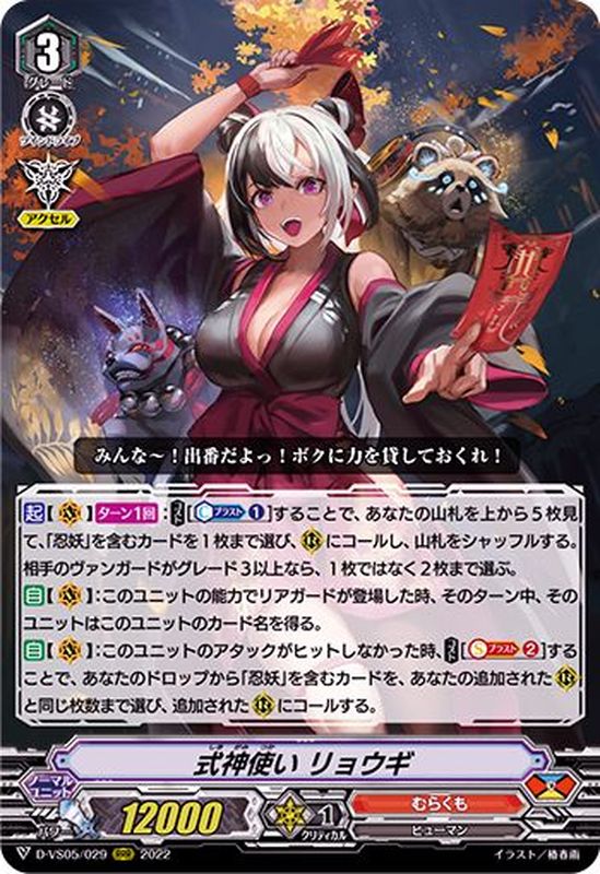 【起】【(V)】【ターン1回】:【コスト】[【カウンターブラスト】(1)]することで、あなたの山札を上から5枚見て、「忍妖」を含むカードを1枚まで選び、(R)にコールし、山札をシャッフルする。相手のヴァンガードがグレード3以上なら、1枚ではなく2枚まで選ぶ。【自】【(V)】:このユニットの能力でリアガードが登場した時、そのターン中、そのユニットはこのユニットのカード名を得る。【自】【(V)】:このユニットのアタックがヒットしなかった時、【コスト】[【ソウルブラスト】(2)]することで、あなたのドロップから「忍妖」を含むカードを、あなたの追加された(R)と同じ枚数まで選び、追加された(R)にコールする。