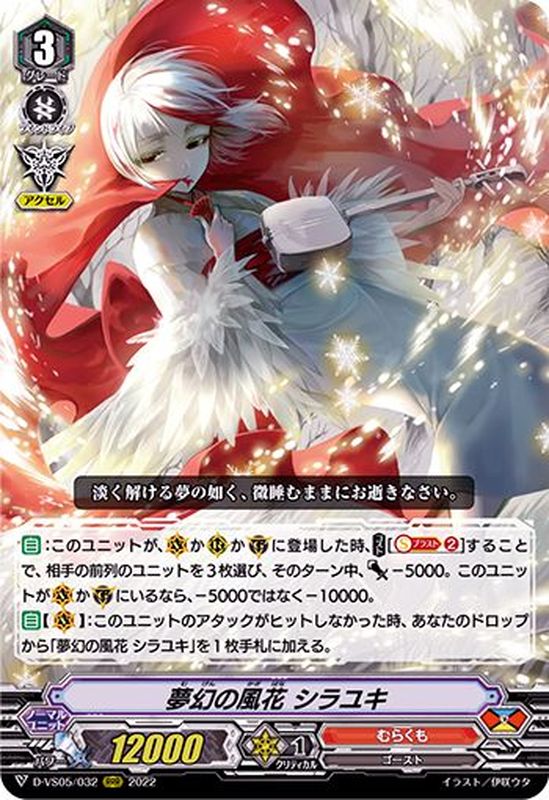 【自】:このユニットが、(V)か(R)か(G)に登場した時、【コスト】[【ソウルブラスト】(2)]することで、相手の前列のユニットを3枚選び、そのターン中、パワー-5000。このユニットが(V)か(G)にいるなら、-5000ではなく-10000。【自】【(V)】:このユニットのアタックがヒットしなかった時、あなたのドロップから「夢幻の風花 シラユキ」を1枚手札に加える。