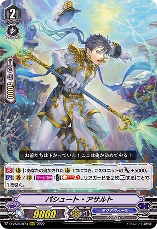 【永】【(R)】:あなたの追加された(R)1つにつき、このユニットのパワー+5000。【起】【(V)/(R)】【ターン1回】:【コスト】[【ソウルブラスト】(1),リアガードを2枚【レスト】する]ことで、1枚引く。