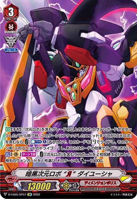 【自】【手札】:「次元ロボ」を含むグレード3以上のあなたのヴァンガードがアタックしたバトル終了時、このターンにアタックしたユニットすべてが「次元ロボ」を含むなら、【コスト】[【カウンターブラスト】(1)]することで、このカードを【スタンド】でライドし、そのターン中、このユニットのドライブ-1し、あなたはカードの効果でライドできない。【起】【(V)】【ターン1回】:【コスト】[「次元ロボ」を含むリアガードを2枚呪縛する]ことで、相手のヴァンガードを1枚選び、そのターン中、パワー-10000。