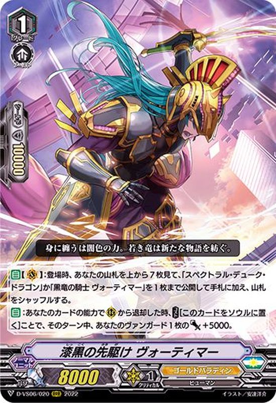 【自】【(V)】:登場時、あなたの山札を上から7枚見て、「スペクトラル・デューク・ドラゴン」か「黒竜の騎士 ヴォーティマー」を1枚まで公開して手札に加え、山札をシャッフルする。【自】:あなたのカードの能力で(R)から退却した時、【コスト】[このカードをソウルに置く]ことで、そのターン中、あなたのヴァンガード1枚のパワー+5000。