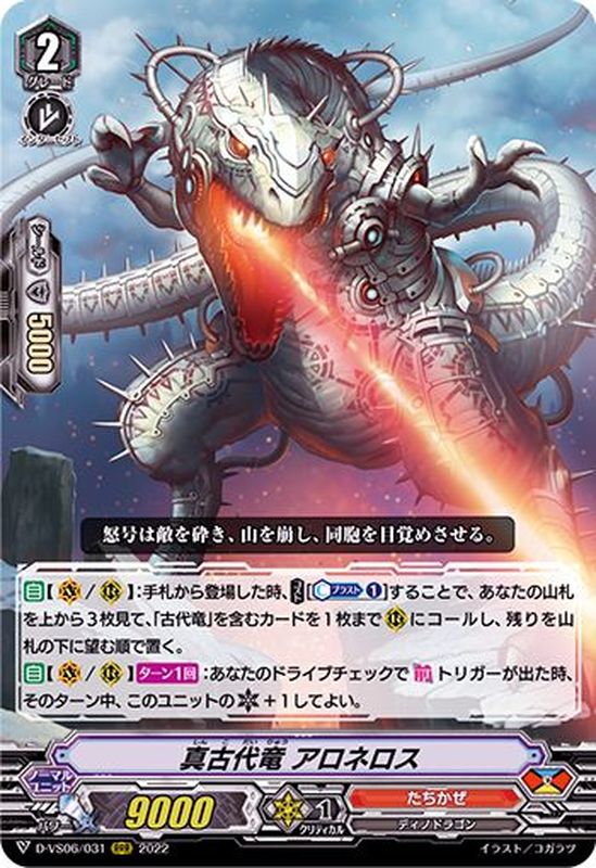 【自】【(V)/(R)】:手札から登場した時、【コスト】[【カウンターブラスト】(1)]することで、あなたの山札を上から3枚見て、「古代竜」を含むカードを1枚まで(R)にコールし、残りを山札の下に望む順で置く。【自】【(V)/(R)]【ターン1回】:あなたのドライブチェックで【前】トリガーが出た時、そのターン中、このユニットのクリティカル+1してよい。