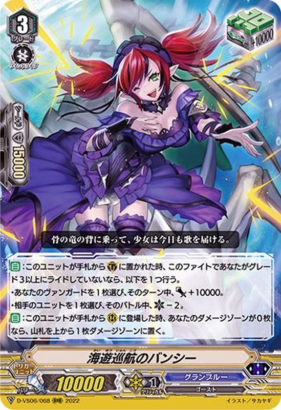 【自】:このユニットが手札から(G)に置かれた時、このファイトであなたがグレード3以上にライドしていないなら、以下を1つ行う。・あなたのヴァンガードを1枚選び、そのターン中、パワー+10000。・相手のユニットを1枚選び、そのバトル中、クリティカル-2。【自】:このユニットが手札から(R)に登場した時、あなたのダメージゾーンが0枚なら、山札を上から1枚ダメージゾーンに置く。