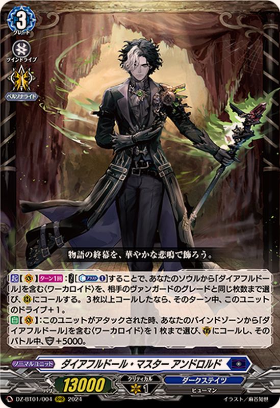 【起】【(V)】【ターン1回】:【コスト】[【カウンターブラスト】(1)]することで、あなたのソウルから「ダイアフルドール」を含む〈ワーカロイド〉を、相手のヴァンガードのグレードと同じ枚数まで選び、(R)にコールする。3枚以上コールしたなら、そのターン中、このユニットのドライブ+1。【自】【(V)】:このユニットがアタックされた時、あなたのバインドゾーンから「ダイアフルドール」を含む〈ワーカロイド〉を1枚まで選び、(G)にコールし、そのバトル中、シールド+5000。