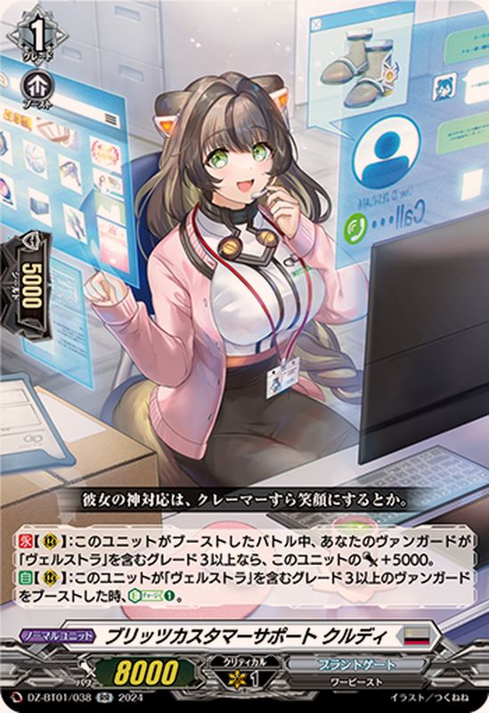 【永】【(R)】:このユニットがブーストしたバトル中、あなたのヴァンガードが「ヴェルストラ」を含むグレード3以上なら、このユニットのパワー+5000。【自】【(R)】:このユニットが「ヴェルストラ」を含むグレード3以上のヴァンガードをブーストした時、【エネルギーチャージ】(1)。