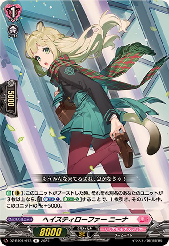 【自】【(R)】:このユニットがブーストした時、あなたのユニットを3枚選ぶ。3枚選んでいて、選ばれたユニットすべてがそれぞれ別名なら、【コスト】[【カウンターブラスト】(1),【エネルギーブラスト】(2)]することで、1枚引き、そのバトル中、このユニットのパワー+5000。