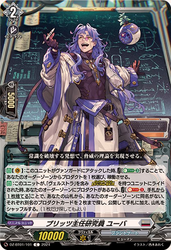 【自】【(V)】:このユニットがヴァンガードにアタックした時、【コスト】[【エネルギーブラスト】(3)]することで、あなたのオーダーゾーンからプロダクトを1枚選び、稼働させる。【自】:このユニットが、「ヴェルストラ」を含み【ディヴァインスキル】を持つユニットにライドされた時、あなたのオーダーゾーンにプロダクトがあるなら、【コスト】[【ソウルブラスト】(1),手札から1枚捨てる]ことで、あなたの山札から、あなたのオーダーゾーンに同名がない、それぞれ別名のプロダクトカードを2枚まで探し、公開して手札に加え、山札をシャッフルする。(1枚だけ探してもよい)