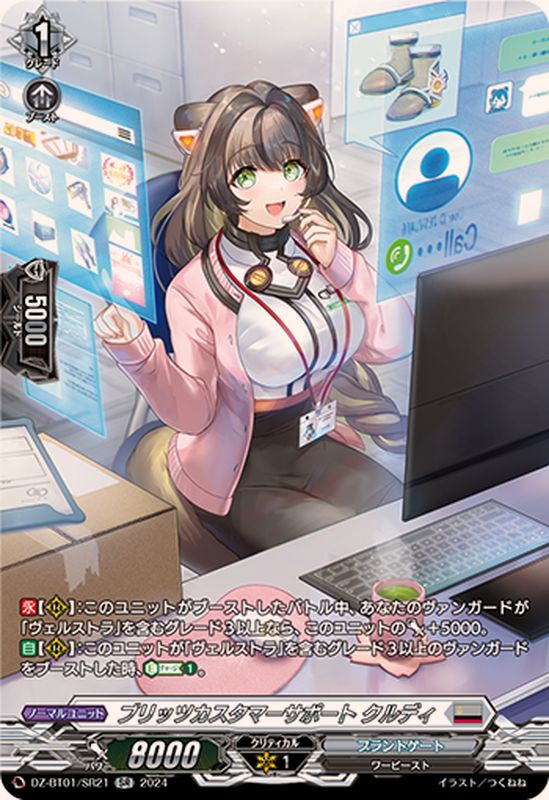 【永】【(R)】:このユニットがブーストしたバトル中、あなたのヴァンガードが「ヴェルストラ」を含むグレード3以上なら、このユニットのパワー+5000。【自】【(R)】:このユニットが「ヴェルストラ」を含むグレード3以上のヴァンガードをブーストした時、【エネルギーチャージ】(1)。