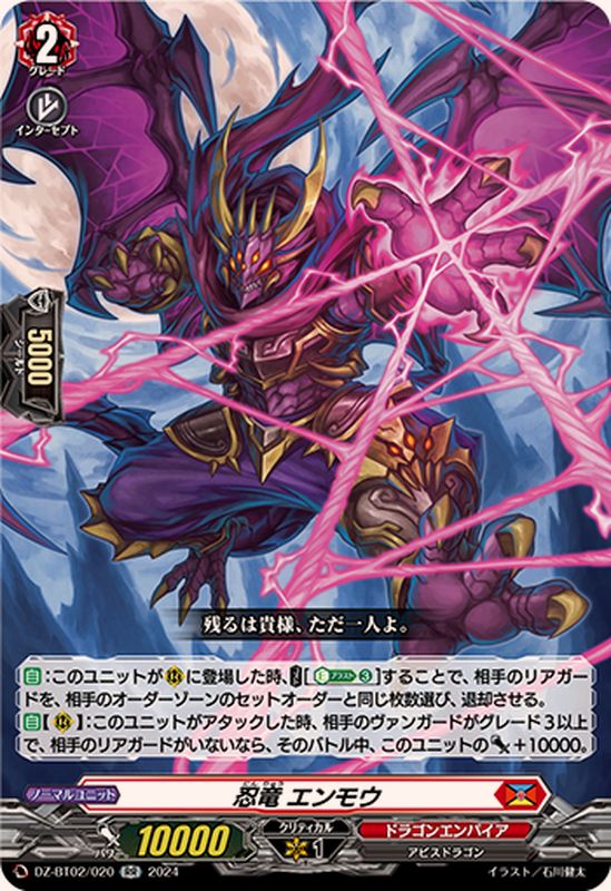 【自】:このユニットが(R)に登場した時、【コスト】[【エネルギーブラスト】(3)]することで、相手のリアガードを、相手のオーダーゾーンのセットオーダーと同じ枚数選び、退却させる。【自】【(R)】:このユニットがアタックした時、相手のヴァンガードがグレード3以上で、相手のリアガードがいないなら、そのバトル中、このユニットのパワー+10000。