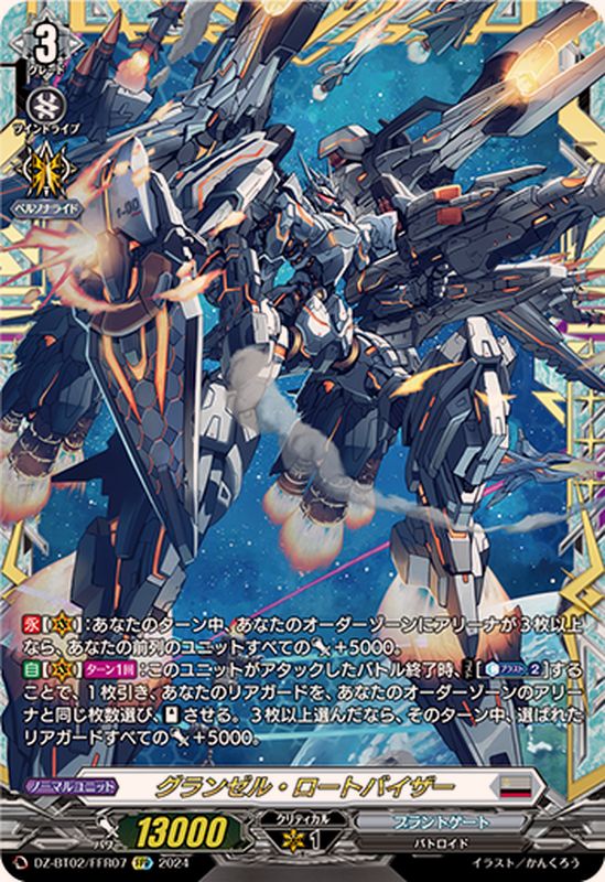 【永】【(V)】:あなたのターン中、あなたのオーダーゾーンにアリーナが3枚以上なら、あなたの前列のユニットすべてのパワー+5000。【自】【(V)】【ターン1回】:このユニットがアタックしたバトル終了時、【コスト】[【カウンターブラスト】(2)]することで、1枚引き、あなたのリアガードを、あなたのオーダーゾーンのアリーナと同じ枚数選び、【スタンド】させる。3枚以上選んだなら、そのターン中、選ばれたリアガードすべてのパワー+5000。