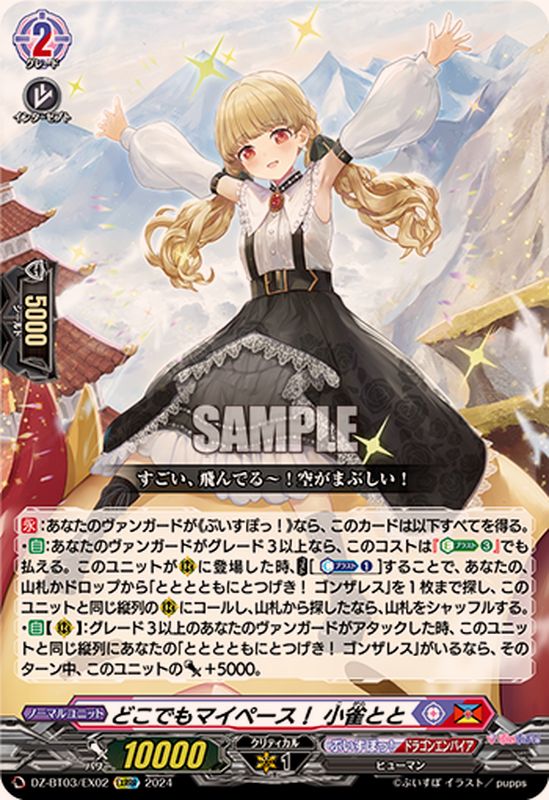 【永】:あなたのヴァンガードが《ぶいすぽっ!》なら、このカードは以下すべてを得る。・【自】:あなたのヴァンガードがグレード3以上なら、このコストは『【エネルギーブラスト】(3)』でも払える。このユニットが(R)に登場した時、【コスト】[【カウンターブラスト】(1)]することで、あなたの、山札かドロップから「とととともにとつげき! ゴンザレス」を1枚まで探し、このユニットと同じ縦列の(R)にコールし、山札から探したなら、山札をシャッフルする。・【自】【(R)】:グレード3以上のあなたのヴァンガードがアタックした時、このユニットと同じ縦列にあなたの「とととともにとつげき! ゴンザレス」がいるなら、そのターン中、このユニットのパワー+5000。