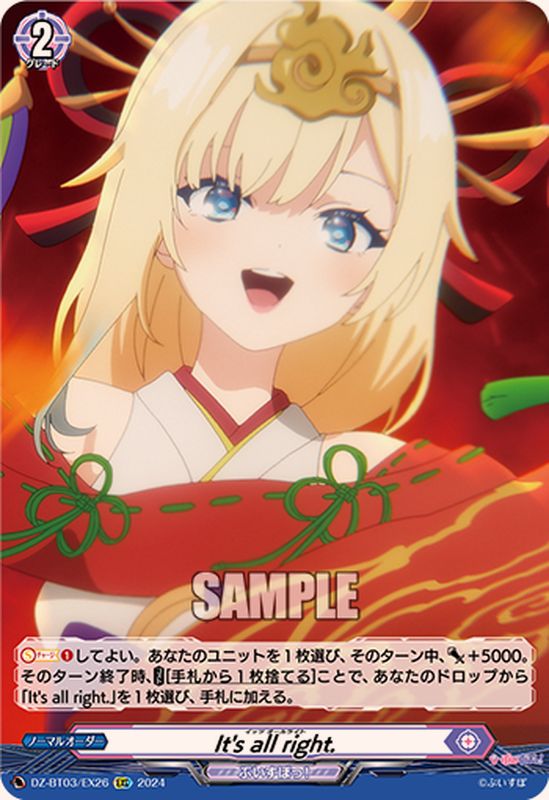 【ソウルチャージ】(1)してよい。あなたのユニットを1枚選び、そのターン中、パワー+5000。そのターン終了時、【コスト】[手札から1枚捨てる]ことで、あなたのドロップから「It's all right.」を1枚選び、手札に加える。