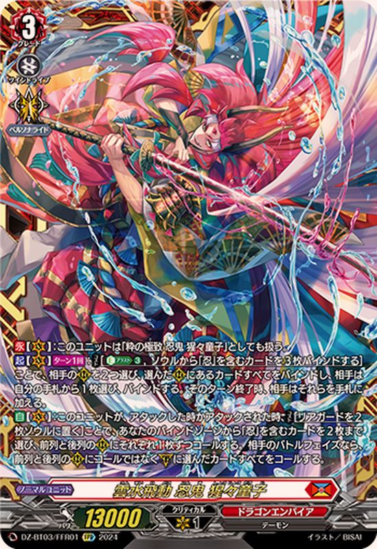 【永】【(V)】:このユニットは「粋の極致 忍鬼 猩々童子」としても扱う。【起】【(V)】【ターン1回】:【コスト】[【エネルギーブラスト】(3),ソウルから「忍」を含むカードを3枚バインドする]ことで、相手の(R)を2つ選び、選んだ(R)にあるカードすべてをバインドし、相手は自分の手札から1枚選び、バインドする。そのターン終了時、相手はそれらを手札に加える。【自】【(V)】:このユニットが、アタックした時かアタックされた時、【コスト】[リアガードを2枚ソウルに置く]ことで、あなたのバインドゾーンから「忍」を含むカードを2枚まで選び、前列と後列の(R)にそれぞれ1枚ずつコールする。相手のバトルフェイズなら、前列と後列の(R)にコールではなく(G)に選んだカードすべてをコールする。