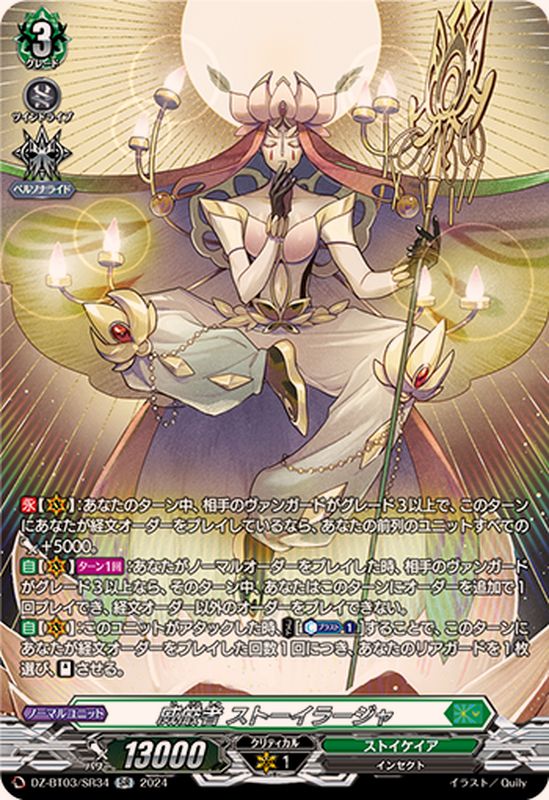 【永】【(V)】:あなたのターン中、相手のヴァンガードがグレード3以上で、このターンにあなたが経文オーダーをプレイしているなら、あなたの前列のユニットすべてのパワー+5000。【自】【(V)】【ターン1回】:あなたがノーマルオーダーをプレイした時、相手のヴァンガードがグレード3以上なら、そのターン中、あなたはこのターンにオーダーを追加で1回プレイでき、経文オーダー以外のオーダーをプレイできない。【自】【(V)】:このユニットがアタックした時、【コスト】[【カウンターブラスト】(1)]することで、このターンにあなたが経文オーダーをプレイした回数1回につき、あなたのリアガードを1枚選び、【スタンド】させる。