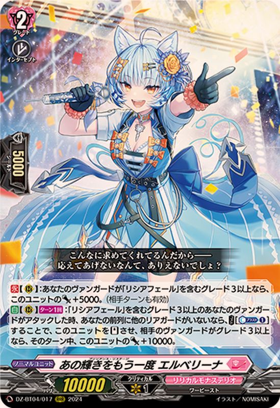 【永】【(R)】:あなたのヴァンガードが「リシアフェール」を含むグレード3以上なら、このユニットのパワー+5000。(相手ターンも有効)【自】【(R)】【ターン1回】:「リシアフェール」を含むグレード3以上のあなたのヴァンガードがアタックした時、あなたの前列に他のリアガードがいないなら、【コスト】[【カウンターブラスト】(1)]することで、このユニットを【スタンド】させ、相手のヴァンガードがグレード3以上なら、そのターン中、このユニットのパワー+10000。