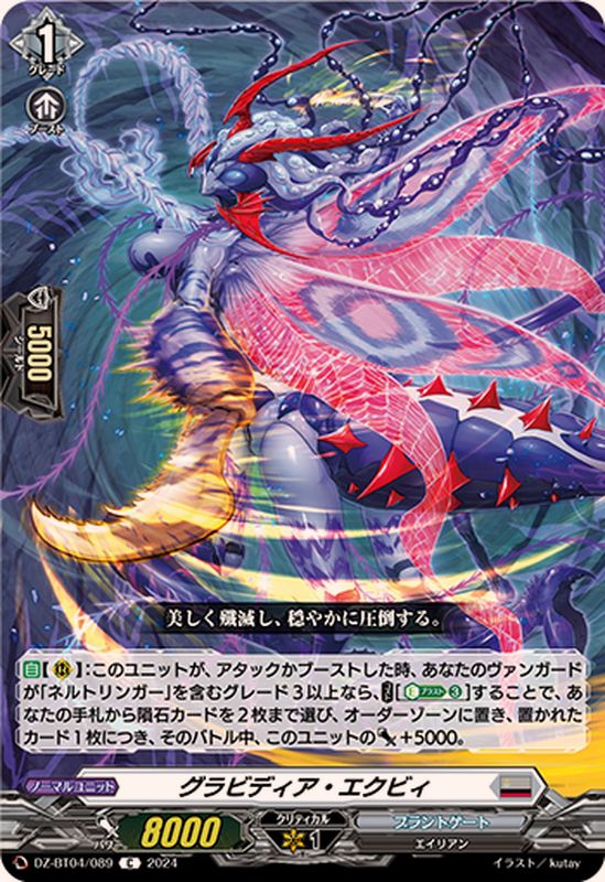 【自】【(R)】:このユニットが、アタックかブーストした時、あなたのヴァンガードが「ネルトリンガー」を含むグレード3以上なら、【コスト】[【エネルギーブラスト】(3)]することで、あなたの手札から隕石カードを2枚まで選び、オーダーゾーンに置き、置かれたカード1枚につき、そのバトル中、このユニットのパワー+5000。