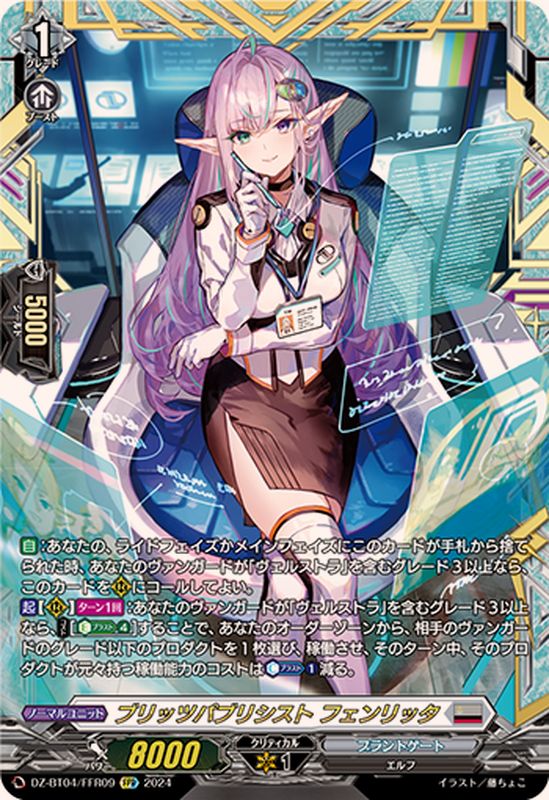 【自】:あなたの、ライドフェイズかメインフェイズにこのカードが手札から捨てられた時、あなたのヴァンガードが「ヴェルストラ」を含むグレード3以上なら、このカードを(R)にコールしてよい。【起】【(R)】【ターン1回】:あなたのヴァンガードが「ヴェルストラ」を含むグレード3以上なら、【コスト】[【エネルギーブラスト】(4)]することで、あなたのオーダーゾーンから、相手のヴァンガードのグレード以下のプロダクトを1枚選び、稼働させ、そのターン中、そのプロダクトが元々持つ稼働能力のコストは【カウンターブラスト】(1)減る。