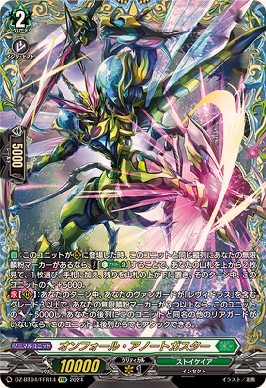 【自】:このユニットが(R)に登場した時、このユニットと同じ縦列にあなたの無限鱗粉マーカーがあるなら、【コスト】[【エネルギーブラスト】(3)]することで、あなたの山札を上から2枚見て、1枚選び、手札に加え、残りを山札の上か下に置き、そのターン中、このユニットのパワー+5000。【永】【(R)】:あなたのターン中、あなたのヴァンガードが「レヴィドラス」を含むグレード3以上で、あなたの無限鱗粉マーカーが3つ以上なら、このユニットのパワー+5000し、あなたの後列にこのユニットと同名の他のリアガードがいないなら、このユニットは後列からでもアタックできる。