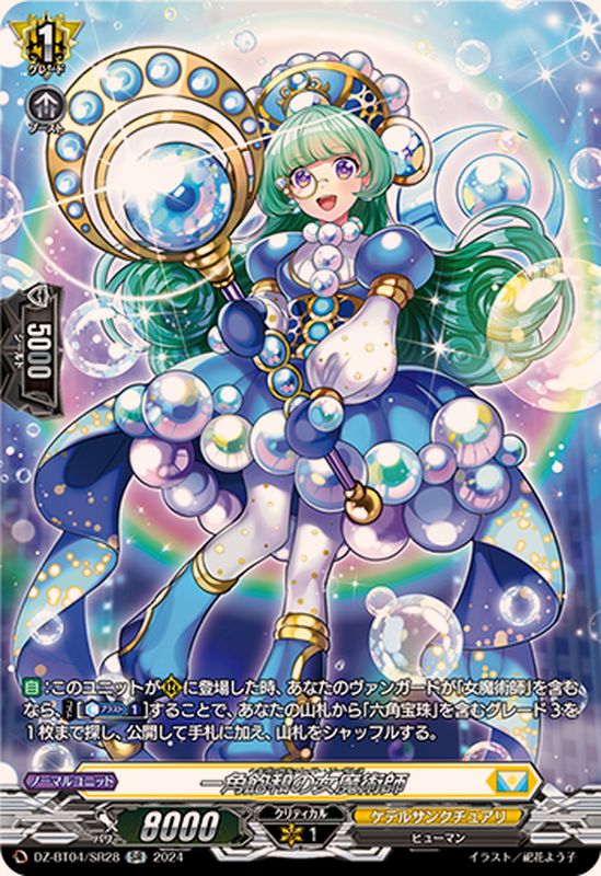 【自】:このユニットが(R)に登場した時、あなたのヴァンガードが「女魔術師」を含むなら、【コスト】[【カウンターブラスト】(1)]することで、あなたの山札から「六角宝珠」を含むグレード3を1枚まで探し、公開して手札に加え、山札をシャッフルする。
