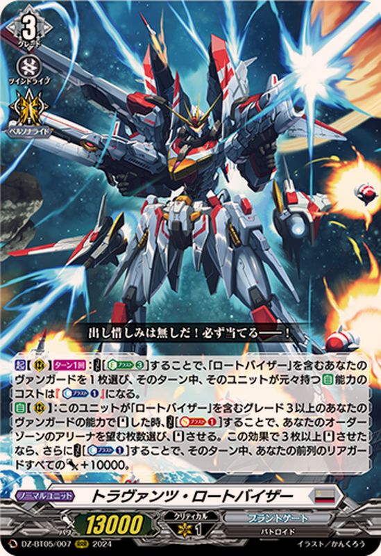 【起】【(R)】【ターン1回】:【コスト】[【エネルギーブラスト】(3)]することで、「ロートバイザー」を含むあなたのヴァンガードを1枚選び、そのターン中、そのユニットが元々持つ【自】能力のコストは『【カウンターブラスト】(1)』になる。【自】【(R)】:このユニットが「ロートバイザー」を含むグレード3以上のあなたのヴァンガードの能力で【スタンド】した時、【コスト】[【ソウルブラスト】(1)]することで、あなたのオーダーゾーンのアリーナを望む枚数選び、【スタンド】させる。この効果で3枚以上【スタンド】させたなら、さらに【コスト】[【カウンターブラスト】(1)]することで、そのターン中、あなたの前列のリアガードすべてのパワー+10000。