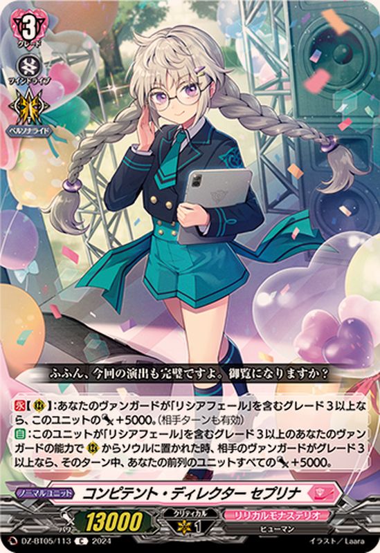 【永】【(R)】:あなたのヴァンガードが「リシアフェール」を含むグレード3以上なら、このユニットのパワー+5000。(相手ターンも有効)【自】:このユニットが「リシアフェール」を含むグレード3以上のあなたのヴァンガードの能力で(R)からソウルに置かれた時、相手のヴァンガードがグレード3以上なら、そのターン中、あなたの前列のユニットすべてのパワー+5000。