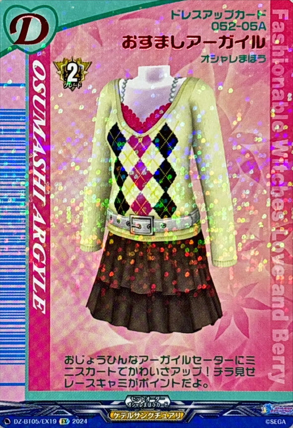 フレバーテキスト:おじょうひんなアーガイルセーターにミニスカートでかわいさアップ!チラ見せレースキャミがポイントだよ。