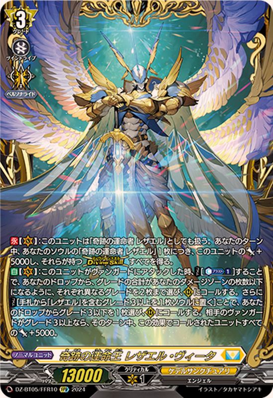 【永】【(V)】:このユニットは「奇跡の運命者 レザエル」としても扱う。あなたのターン中、あなたのソウルの「奇跡の運命者 レザエル」1枚につき、このユニットのパワー+5000し、それらが持つ【ディヴァインスキル】すべてを得る。【自】【(V)】:このユニットがヴァンガードにアタックした時、【コスト】[【カウンターブラスト】(1)]することで、あなたのドロップから、グレードの合計があなたのダメージゾーンの枚数以下になるように、それぞれ異なるグレードを2枚まで選び、(R)にコールする。さらに【コスト】[手札から「レザエル」を含むグレード3以上を1枚ソウルに置く]ことで、あなたのドロップからグレード3以下を1枚選び、(R)にコールする。相手のヴァンガードがグレード3以上なら、そのターン中、この効果でコールされたユニットすべてのパワー+5000。