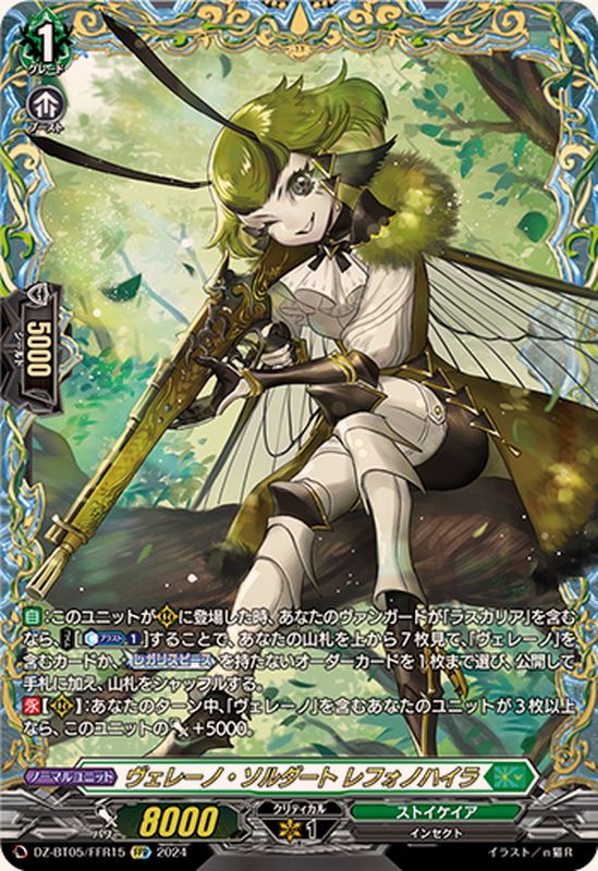 【自】:このユニットが(R)に登場した時、あなたのヴァンガードが「ラスカリア」を含むなら、【コスト】[【カウンターブラスト】(1)]することで、あなたの山札を上から7枚見て、「ヴェレーノ」を含むカードか、【レガリスピース】を持たないオーダーカードを1枚まで選び、公開して手札に加え、山札をシャッフルする。【永】【(R)】:あなたのターン中、「ヴェレーノ」を含むあなたのユニットが3枚以上なら、このユニットのパワー+5000。