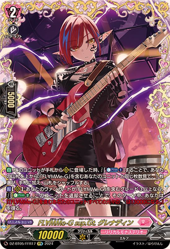 【自】:このユニットが手札から(R)に登場した時、【コスト】[【カウンターブラスト】(1)]することで、あなたの山札を上から、「FL∀MMe-G」を含むあなたのユニットと同じ枚数見て、1枚選び、手札に加え、山札をシャッフルする。【起】【(R)】:あなたのヴァンガードが「FL∀MMe-G」を含むグレード3以上なら、【コスト】[【エネルギーブラスト】(2),このユニットを退却させる]ことで、そのターン中、あなたは『「FL∀MMe-G」を含むあなたのユニットすべての元々のパワーは13000になる。』を得る。