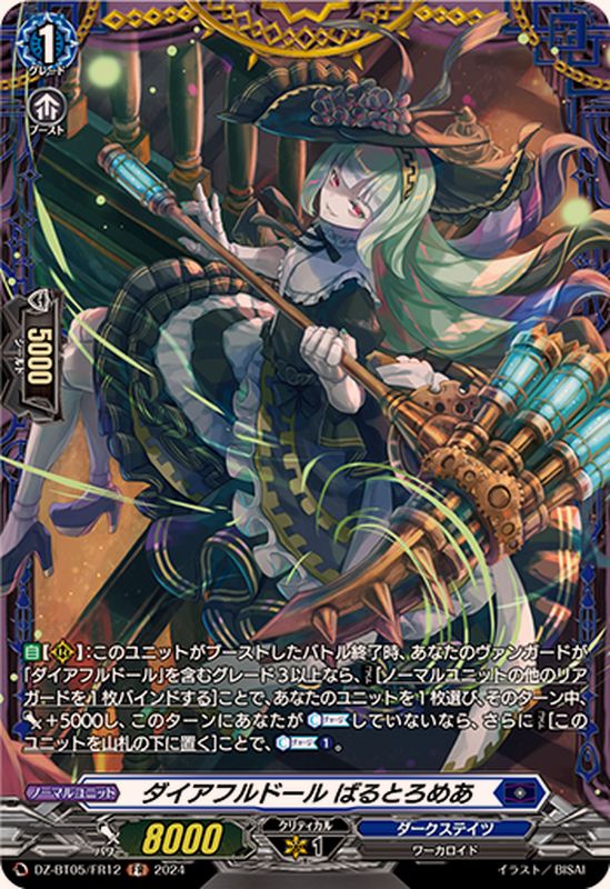 【自】【(R)】:このユニットがブーストしたバトル終了時、あなたのヴァンガードが「ダイアフルドール」を含むグレード3以上なら、【コスト】[ノーマルユニットの他のリアガードを1枚バインドする]ことで、あなたのユニットを1枚選び、そのターン中、パワー+5000し、このターンにあなたが【カウンターチャージ】していないなら、さらに【コスト】[このユニットを山札の下に置く]ことで、【カウンターチャージ】(1)。