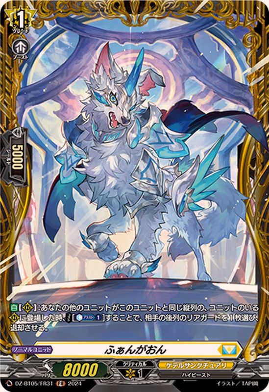 【自】【(R)】:あなたの他のユニットがこのユニットと同じ縦列の、ユニットのいる(R)に登場した時、【コスト】[【カウンターブラスト】(1)]することで、相手の後列のリアガードを1枚選び、退却させる。