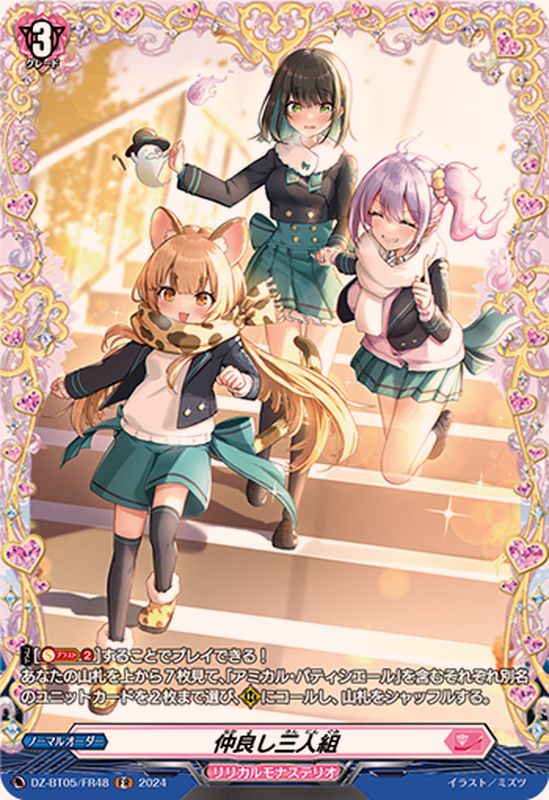【コスト】[【ソウルブラスト】(2)]することでプレイできる!あなたの山札を上から7枚見て、「アミカル・パティシエール」を含むそれぞれ別名のユニットカードを2枚まで選び、(R)にコールし、山札をシャッフルする。