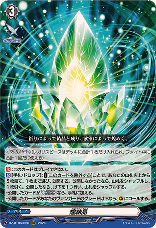 【レガリスピース】(レガリスピースはデッキに合計1枚だけ入れられ、ファイト中に合計1回だけ使える) 【永】:このカードはプレイできない。【起】【手札/ドロップ】:【コスト】[このカードを除外する]ことで、あなたの山札を上から5枚見て、1枚まで選び、公開する。公開しなかったなら、山札をシャッフルし、1枚引く。公開したなら、以下を1つ行い、山札をシャッフルする。・公開したカードが【煌求者】なら、手札に加える。・公開したカードがあなたのヴァンガードのグレード以下なら、(R)にコールする。