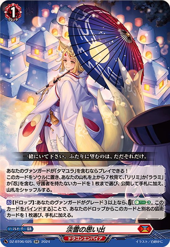 あなたのヴァンガードが「タマユラ」を含むならプレイできる!このカードをソウルに置き、あなたの山札を上から7枚見て、「リリミ」か「ララミ」か「忍」を含む、守護者を持たないカードを1枚まで選び、公開して手札に加え、山札をシャッフルする。【起】【ドロップ】:あなたのヴァンガードがグレード3以上なら、【コスト】[【エネルギーブラスト】(3),このカードをバインドする]ことで、あなたのドロップからこのカードと別名の狐術カードを1枚選び、手札に加える。