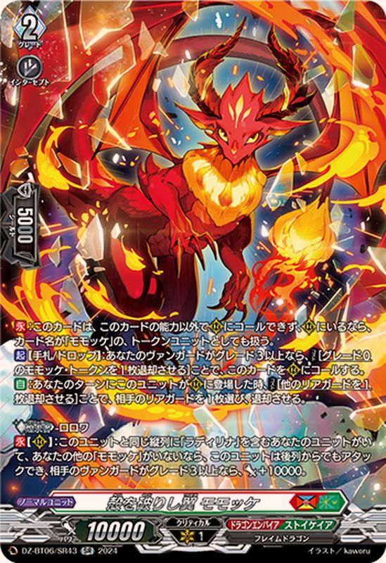【永】:このカードは、このカードの能力以外で(R)にコールできず、(R)にいるなら、カード名が「モモッケ」の、トークンユニットとしても扱う。【起】【手札/ドロップ】:あなたのヴァンガードがグレード3以上なら、【コスト】[グレード0のモモッケ・トークンを1枚退却させる]ことで、このカードを(R)にコールする。【自】:あなたのターンにこのユニットが(R)に登場した時、【コスト】[他のリアガードを1枚退却させる]ことで、相手のリアガードを1枚選び、退却させる。【煌求者】-ロロワ【永】【(R)】:このユニットと同じ縦列に「ラディリナ」を含むあなたのユニットがいて、あなたの他の「モモッケ」がいないなら、このユニットは後列からでもアタックでき、相手のヴァンガードがグレード3以上なら、パワー+10000。