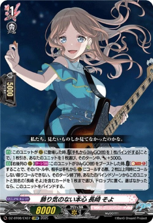 【自】【右後列の(R)】【ターン1回】:このユニットが〈MyGO!!!!!〉をブーストした時、【コスト】[【ソウルブラスト】(1)]することで、そのバトル中、相手は手札から(G)にコールする際、2枚以上同時にコールしない限りコールできない。そのターン終了時、あなたのバインドゾーンからこのユニットと別名の「長崎 そよ」を含むカードを1枚まで選び、ドロップに置く。選ばなかったなら、このユニットをバインドする。