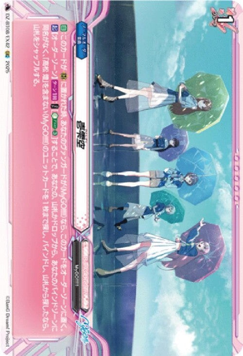 【自】:このカードが(R)に置かれた時、あなたのヴァンガードが〈MyGO!!!!!〉なら、このカードをオーダーゾーンに置く。