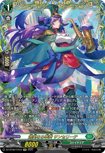 【起】【ドロップ】:あなたのヴァンガードが、「リアノーン」か「マグノリア」を含むグレード3以上で、相手のヴァンガードがグレード3以上なら、【コスト】[このカードを山札の下に置く]ことで、あなたのリアガードを1枚選び、そのターン中、そのユニットの元々のパワーは15000になる。このターンにあなたがペルソナライドしているなら、15000ではなく20000。