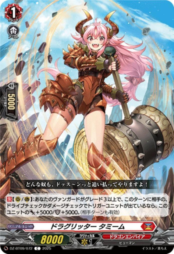 【永】【(R)/(G)】:あなたのヴァンガードがグレード3以上で、このターンに相手の、ドライブチェックかダメージチェックでトリガーユニットが出ているなら、このユニットのパワー+5000/シールド+5000。(相手ターンも有効)