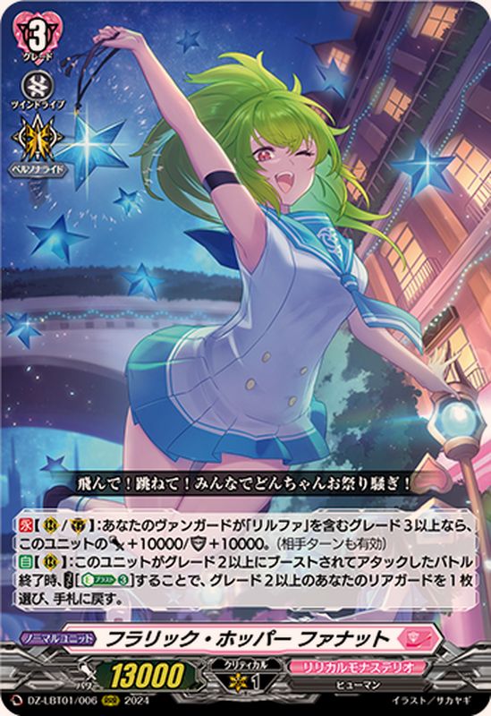 【永】【(R)/(G)】:あなたのヴァンガードが「リルファ」を含むグレード3以上なら、このユニットのパワー+10000/シールド+10000。(相手ターンも有効)【自】【(R)】:このユニットがグレード2以上にブーストされてアタックしたバトル終了時、【コスト】[【エネルギーブラスト】(3)]することで、グレード2以上のあなたのリアガードを1枚選び、手札に戻す。