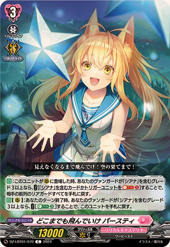 【自】:このユニットが(R)に登場した時、あなたのヴァンガードが「シアナ」を含むグレード3以上なら、【コスト】[「シアナ」を含むカードかトリガーユニットを【ソウルブラスト】(1)]することで、相手の前列のリアガードすべてを手札に戻す。【自】【(R)】:あなたのターン終了時、あなたのヴァンガードが「シアナ」を含むグレード3以上なら、【コスト】[【エネルギーブラスト】(3)]することで、このユニットを手札に戻す。