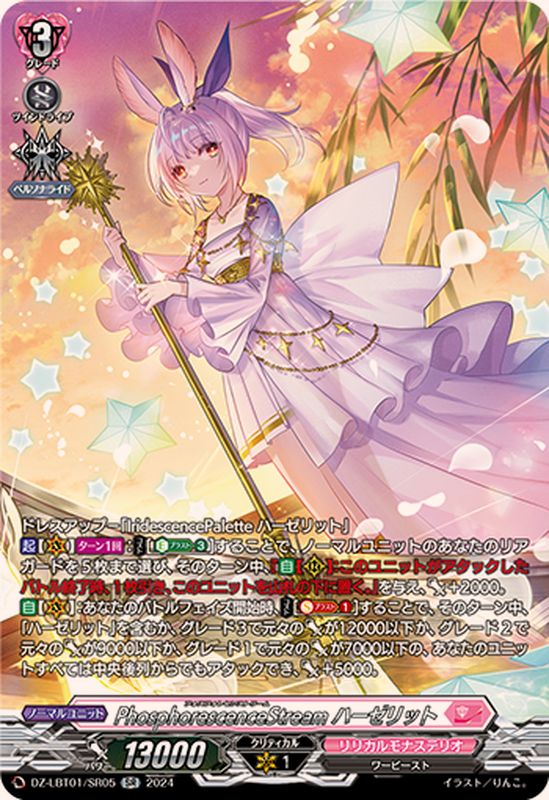 ドレスアップ-「IridescencePalette ハーゼリット」【起】【(V)】【ターン1回】:【コスト】[【エネルギーブラスト】(3)]することで、ノーマルユニットのあなたのリアガードを5枚まで選び、そのターン中、『【自】【(R)】:このユニットがアタックしたバトル終了時、1枚引き、このユニットを山札の下に置く。』を与え、パワー+2000。【自】【(V)】:あなたのバトルフェイズ開始時、【コスト】[【ソウルブラスト】(1)]することで、そのターン中、「ハーゼリット」を含むか、グレード3で元々のパワーが12000以下か、グレード2で元々のパワーが9000以下か、グレード1で元々のパワーが7000以下の、あなたのユニットすべては中央後列からでもアタックでき、パワー+5000。